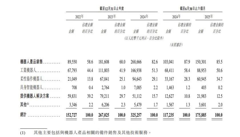 驱动增长的核心是产品结构优化,高毛利率的机器人产品销售占比从2022年的58.6%提升至2025年上半年的85.5%,而低毛利率的解决方案占比从39.2%降至12.5%。